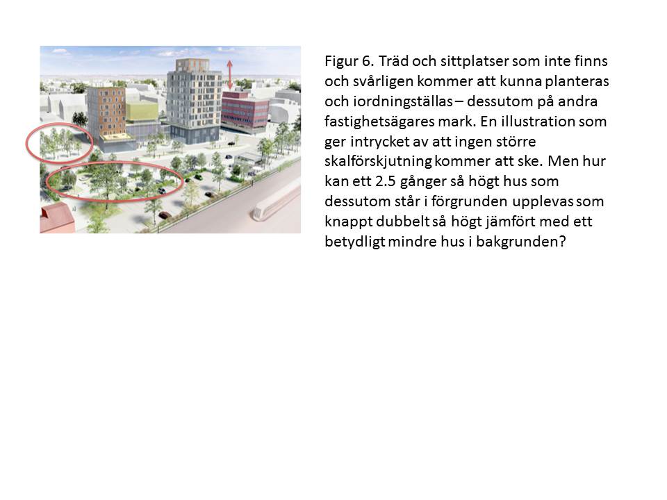 Vi undrar t.ex. hur den byggnad, delvis byggd i glas och som utgör tretornshusets bottenplan, enligt solstudierna kan anses sakna skuggverkan. Det är också mycket svårt att tyda hur detta bottenplan, som får byggas upp till 10 meter högt enligt plankartan, kommer att placeras – det skiljer sig åt mellan de olika skisser som presenteras i materialet, se t.ex. figur 1 och 2. Även den 10 meter höga byggnaden kommer delvis att skugga torget och frågan är om detta sammantaget verkligen kan förbättra ljusförhållandena på platsen och hur mycket vi kommer se av detta ”spel med ljus och skugga” som planbeskrivningen målar upp.