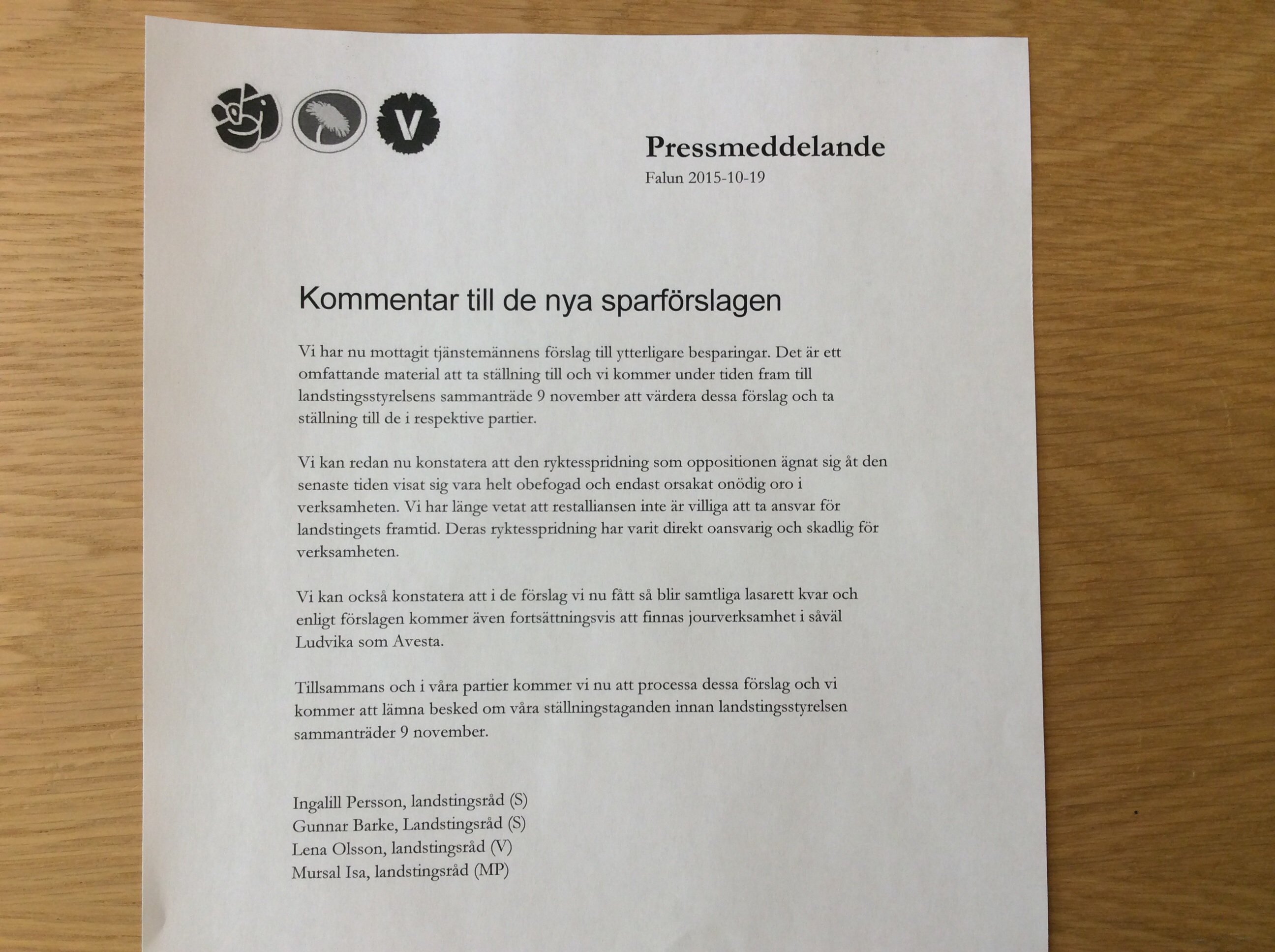 Pressmeddelande från landstingsledningen med anledning av att struktur-och förändringsplanen del 2 överlämnades från tjänstemännen till politikerna. Avsikten är ytterligare besparingar på ca 330 Mkr förutom de tidigare beslutade 350 Mkr i del 1 av planen.