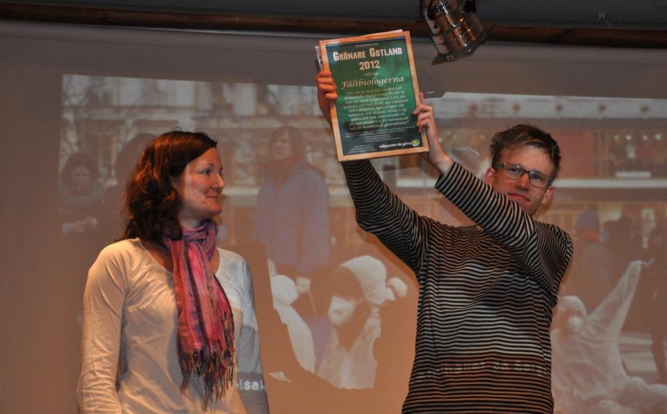 Utmärkelsen överlämnades av Miljöpartiet de gröna på Gotlands ordförande Isabel Enström till Fältbiologernas ordförande Salomon Abresparr i samband med Fältbiologernas Riksårsmöte på Gotland första helgen i januari. Foto: Fältbiologerna