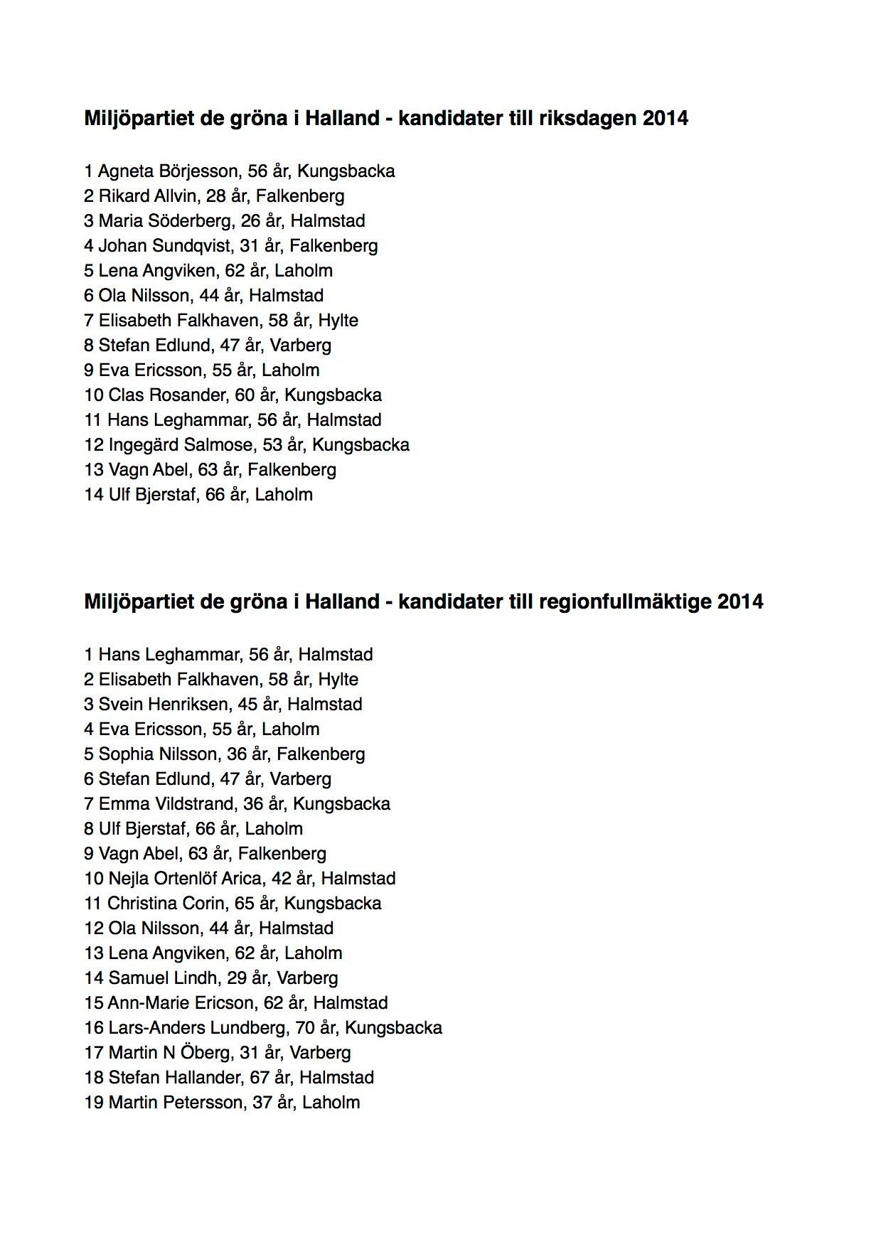 Den 16 november samlades MP Hallands medlemmar i Falkenberg för att besluta om listorna till riksdag och region för valet 2014. Så här blev resultatet: