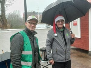 Vi stod på tomtens dag i Skoghall. Paraply behövdes