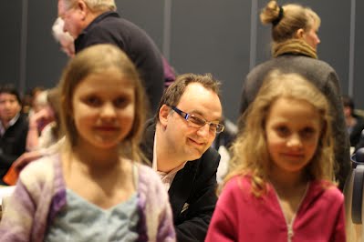 (På bilden tittar Martin Ragnar fram mellan fotografen Johan Svensks två suddiga döttrar)