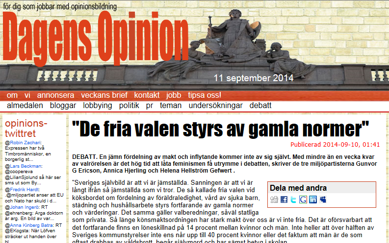 DEBATT. En jämn fördelning av makt och inflytande kommer inte av sig självt. Med mindre än en vecka kvar av valrörelsen är det hög tid att låta feminismen få utrymme i debatten, skriver de tre miljöpartisterna Gunvor G Ericson, Annica Hjerling och Helena Hellström Gefwert .