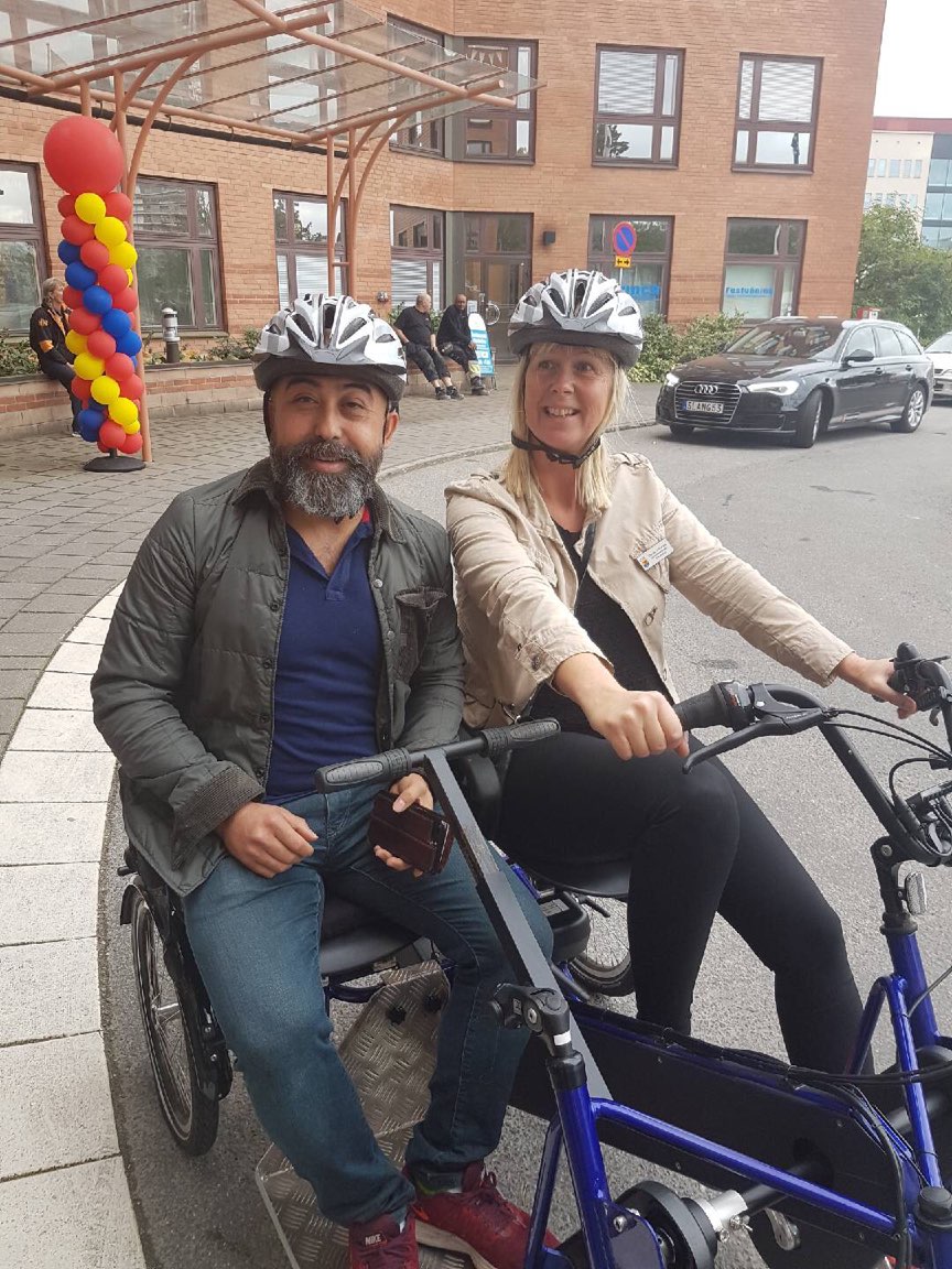 På bilden ses Ahmet Ugan (MP) åka elcykel. Elcykel är ett bra verktyg för att kunna få motion och upplevelser även på äldre år eller när sjukdom inträffar.