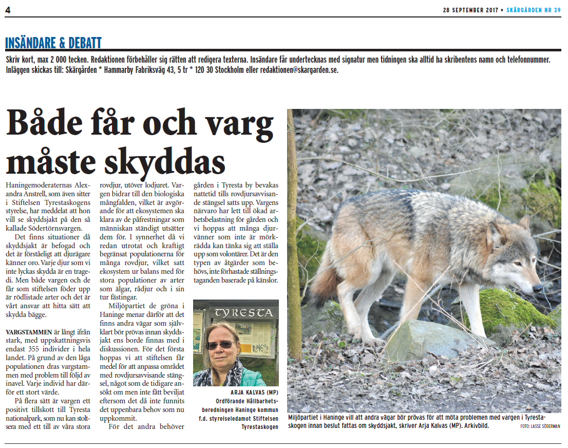 ”När Tyresta Nationalpark fått påhälsning av ytterligare ett rovdjur, den norska varghonan, så vill Miljöpartiet förtydliga att alla vilda djur, även rovdjur, är viktiga för den biologiska mångfalden”, säger Arja Kalvas (MP) Ordförande i Hållbarhetsberedningen och före detta styrelseledamot i Stiftelsen Tyrestaskogen.