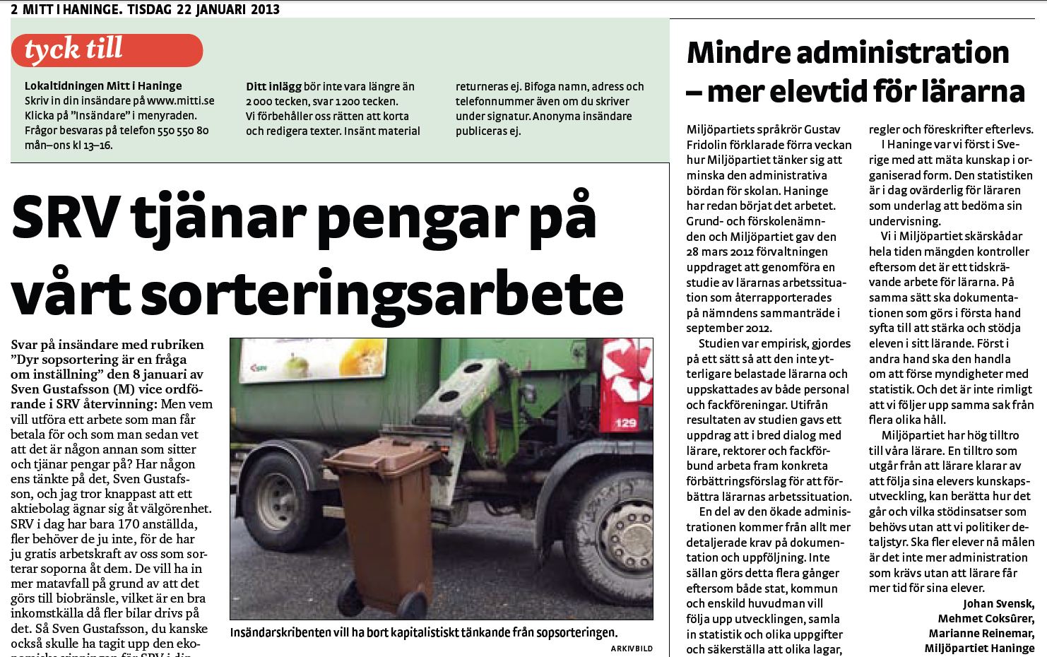 Insändare i Mitt i Haninge i veckan.