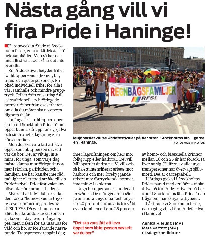 Miljöpartiet Haninges och Södertäljes toppkandidater till Riksdagen, Annica Hjerling och Mats Pertoft, skriver i Mitt i Haninge om att HBTQ-frågorna behöver lyftas även i förorten: