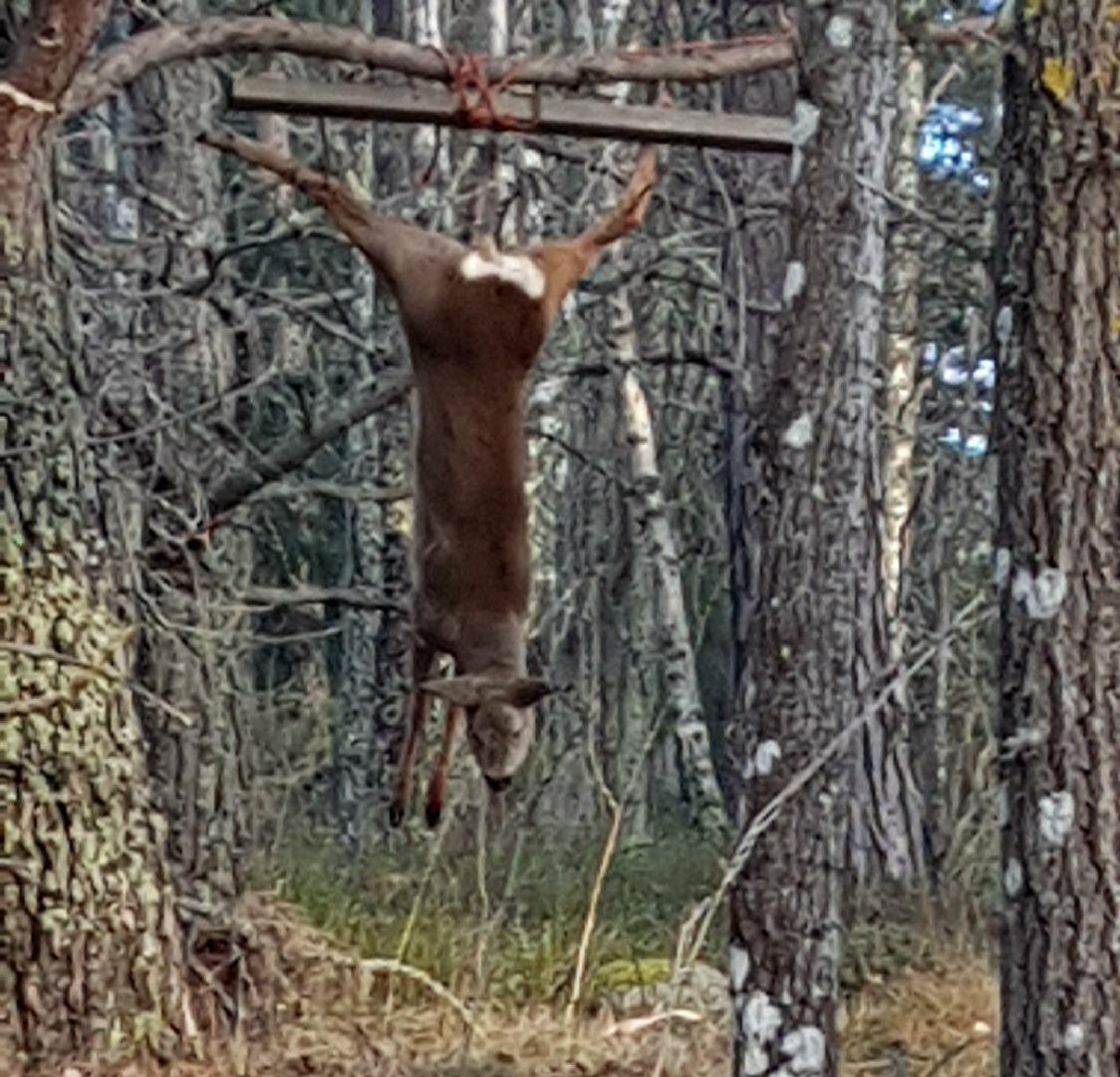 Samtidigt har det inkommit en bild på en åtel (lock-anordning) för rovdjur (se bilden). Som ni ser är det ett rådjur som är upphängt på en åtel. Detta alltså här i Haninge. Det kan verka konstigt att man får hänga upp döda rådjur som lockbete åt rovdjur. Det tyckte i alla fall vi när vi först nåddes av informationen. Men om det är lagligt och etiskt riktigt att åtla med döda djur beror på syftet. Alliansregeringen beslutade nämligen 2013 att detta är lagligt om det inte är i detaljplanerat område. Och givetvis måste man ha rätt att jaga det rovdjur som man avser locka till åteln. Jakt på rovdjur i Haninge är tillåtet på t.ex rävar. Jakt är normalt tillåtet på egen mark om man följer Jaktlagen och riktlinjer från Länsstyrelsen. Jaktförbundet har naturligtvis inga betänkligheter med detta men för dem är det viktigt att man åtlar mer än 200 meter från tomtgränsen för att man inte ska snuva grannen på jakttrofén (!). Vid kontakt med Länsstyrelsen så vill man, som tidigare framkommit, inte lämna några uppgifter om Grimmas dödande för att det har förekommit hot mot boende i vissa områden i Grimmas revir. Inte hot mot jägarna alltså, vilket vi först uppfattade det som eftersom namnet på jaktledare och jägare är hemligstämplade. Av samma skäl vill inte Miljöpartiet uppge vart denna bild på åteln är fotograferad men vid kontakt med Länsstyrelsen så intygade tjänstemannen att det inte var på samma plats som Grimma blev skjuten. Därmed finns inget mer att göra i denna fråga just nu.