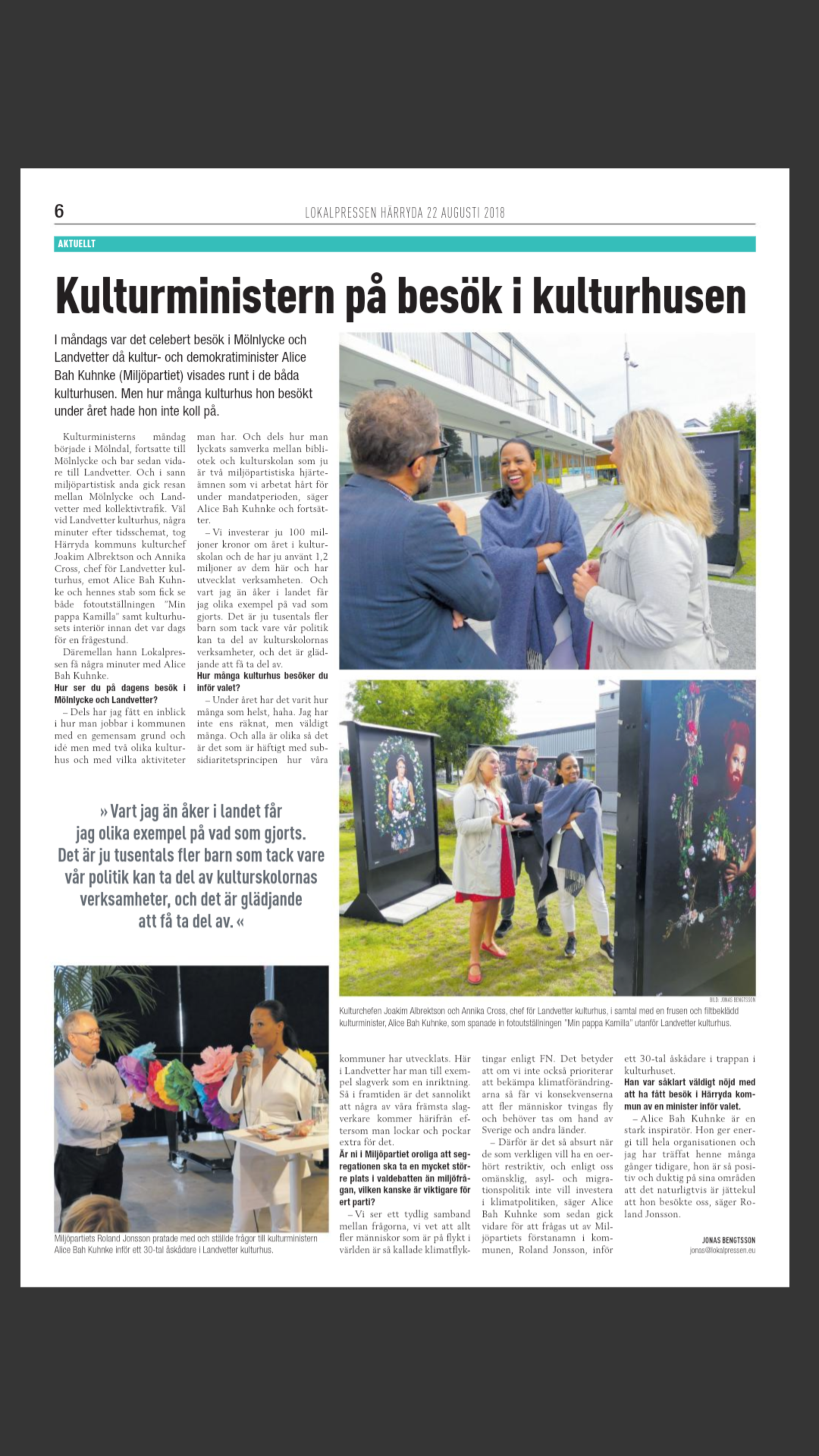 Artikel i Lokalpressen den 22 augusti 2018 om Kultur och demokratiministern Alice Bah Kuhnkes besök i Härryda kommun.