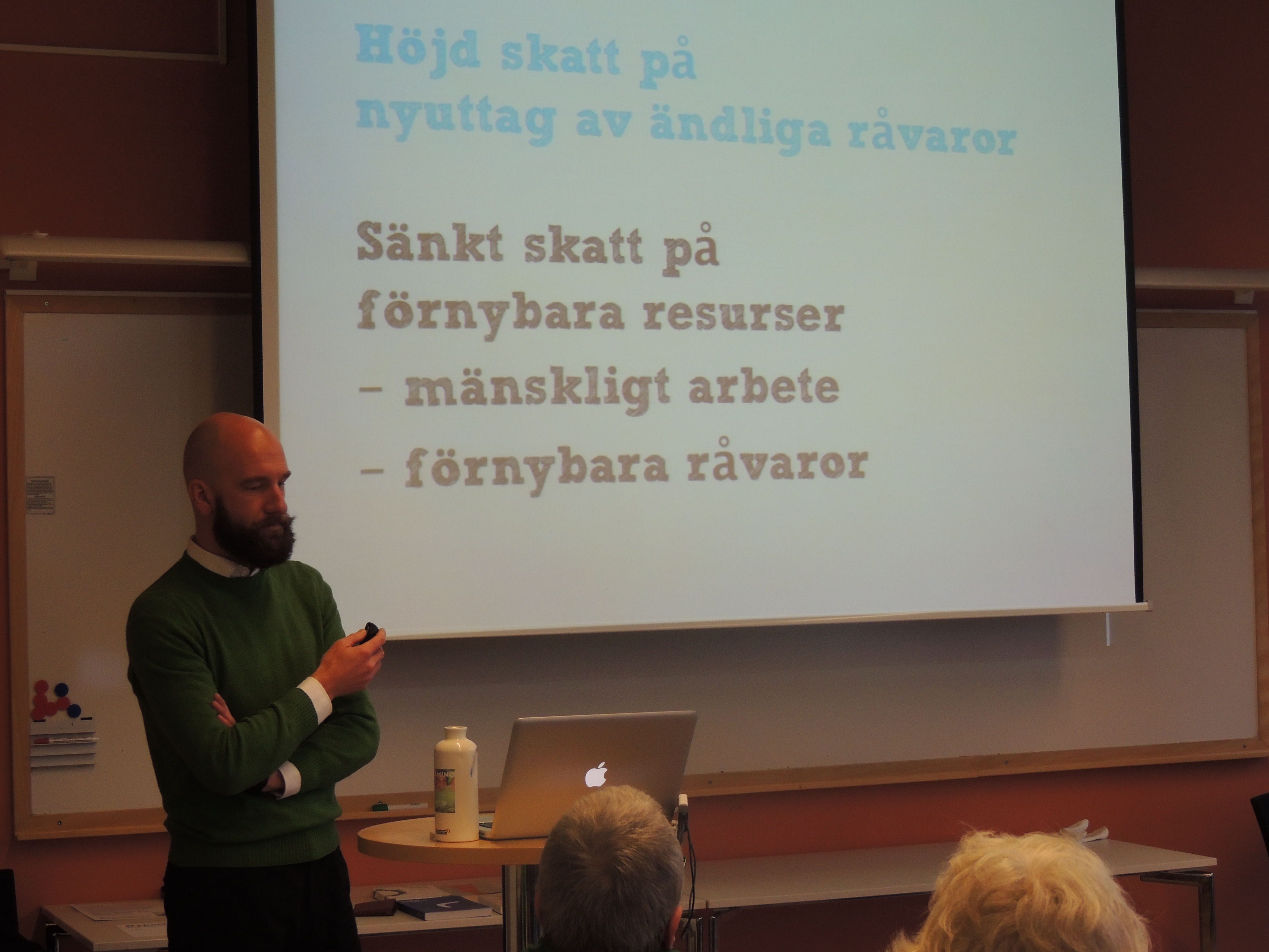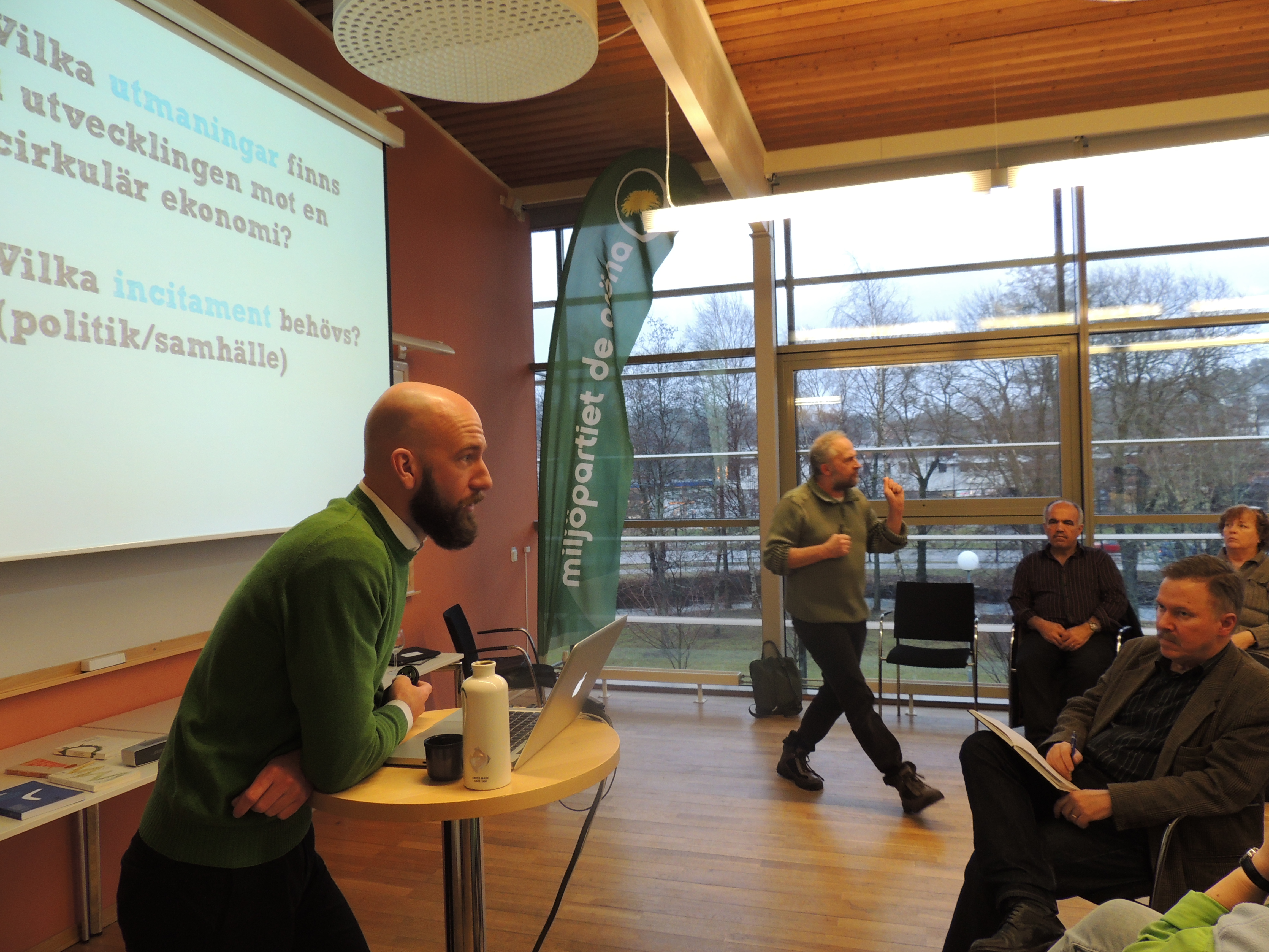 Tobias Jansson som är journalist och skribent på ämnet cikulär ekonomi (http://circulareconomy.se/) höll under söndageftermiddagen en mycket spännande och uppskattad föreläsning. Vi har även hjälp av Leif Engström från Miljöpartiet de gröna i Mölndal som moderator av samtal och diskussion i samband med föreläsningen.