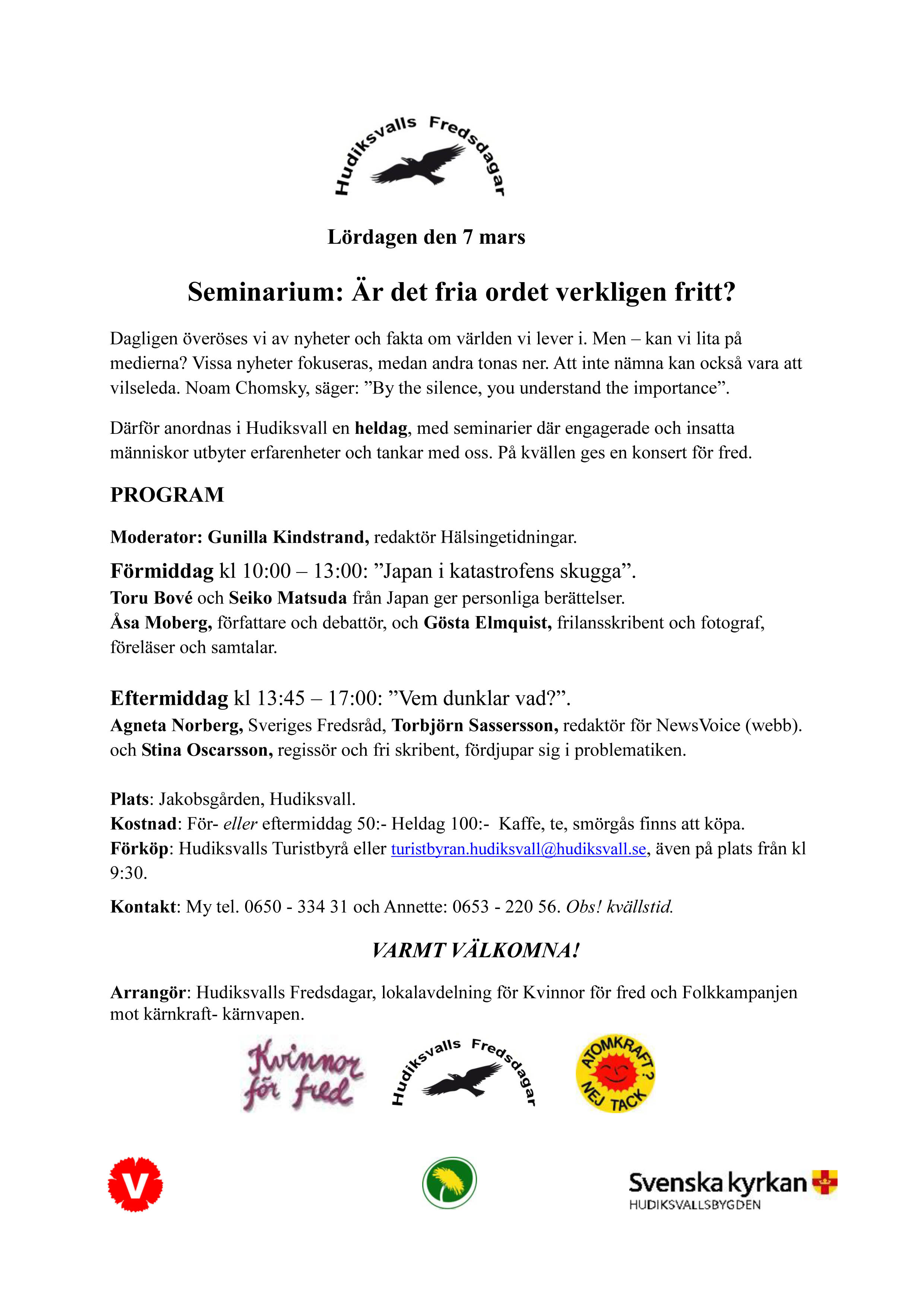 Lördagen den 7 MarsSeminarium:”Är det fria ordet verkligen fritt?”