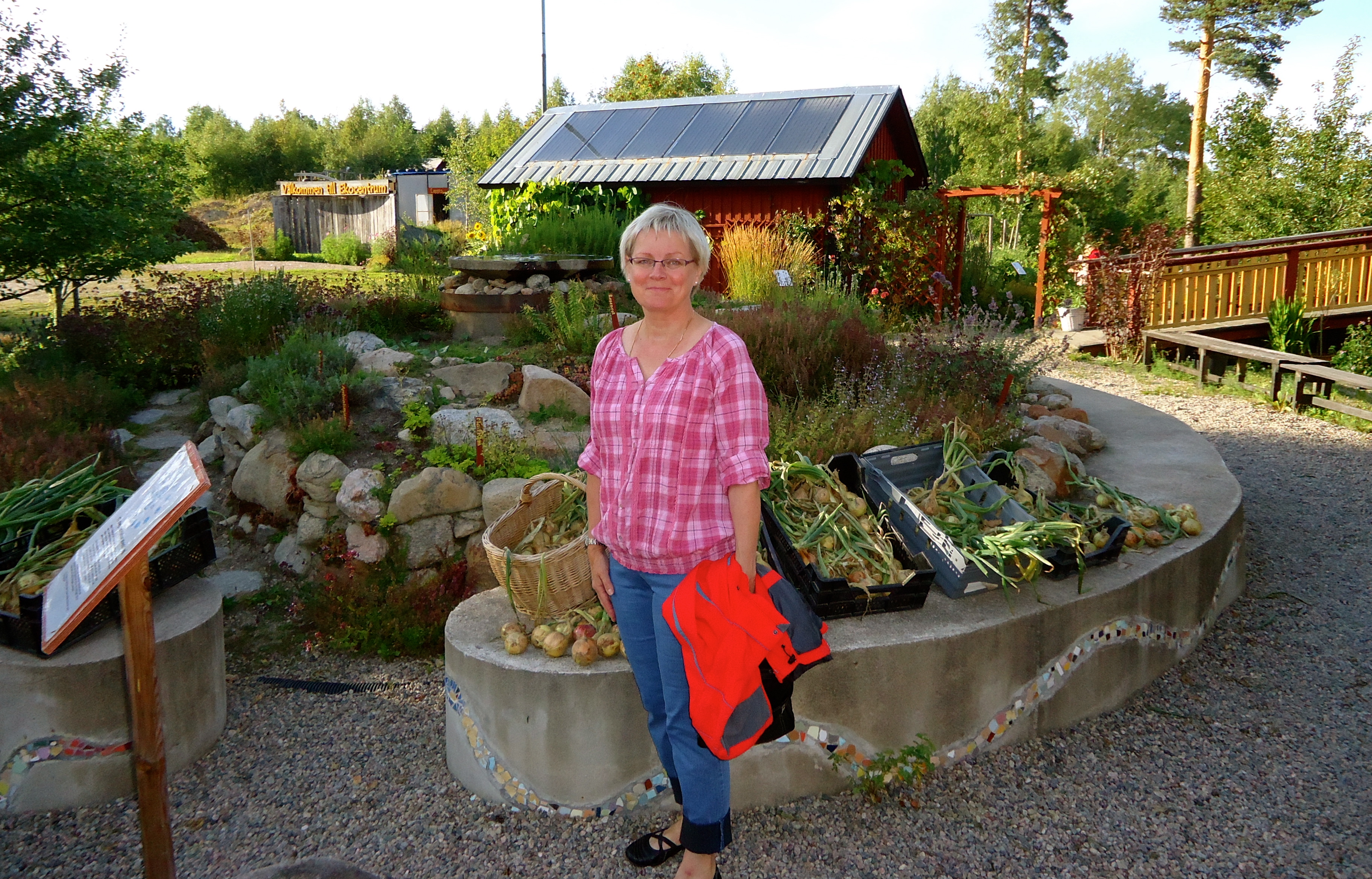 Några smakprov från föreläsningen. Permakultur är ett system där energin används på ett vettigt sätt. Det som används ofta ska tillvaratas nära. Varje del ska fylla flera funktioner. Varje behov ska täckas av så många källor som möjligt. Ett växthus ska ha tungt material, ex stenar, som kan lagra värmen eftersom växthuset kyls fort. Det finns 7 el 8 sätt att fånga in solen. 8årigt växelbruk gör att åkern inte behöver ligga i träda. Permakultur står för ”12 grundprinciper” som Växhuset har integrerat t.ex. att utgå från naturen – se och interagera, att fånga in solenergin samt lagra, att låta djuren vara med och hjälpa till…. Fosforbristen löses genom urinseparering. Växterna bryter ner läkemedel som antibiotika.( Söderhamn har anlagt våtmark!) Att sluta kretsloppet lokalt! Fekalier får ligga i flera år innan vi använder det. Terra Preta – den svarta jorden är träkol som man inte förbränner utan som grävs ned i odlingar – och som skapar ett rikt mikroliv i jorden. Dessförinnan ska träkolen ha ”laddats” med urin/ nässelvatten.