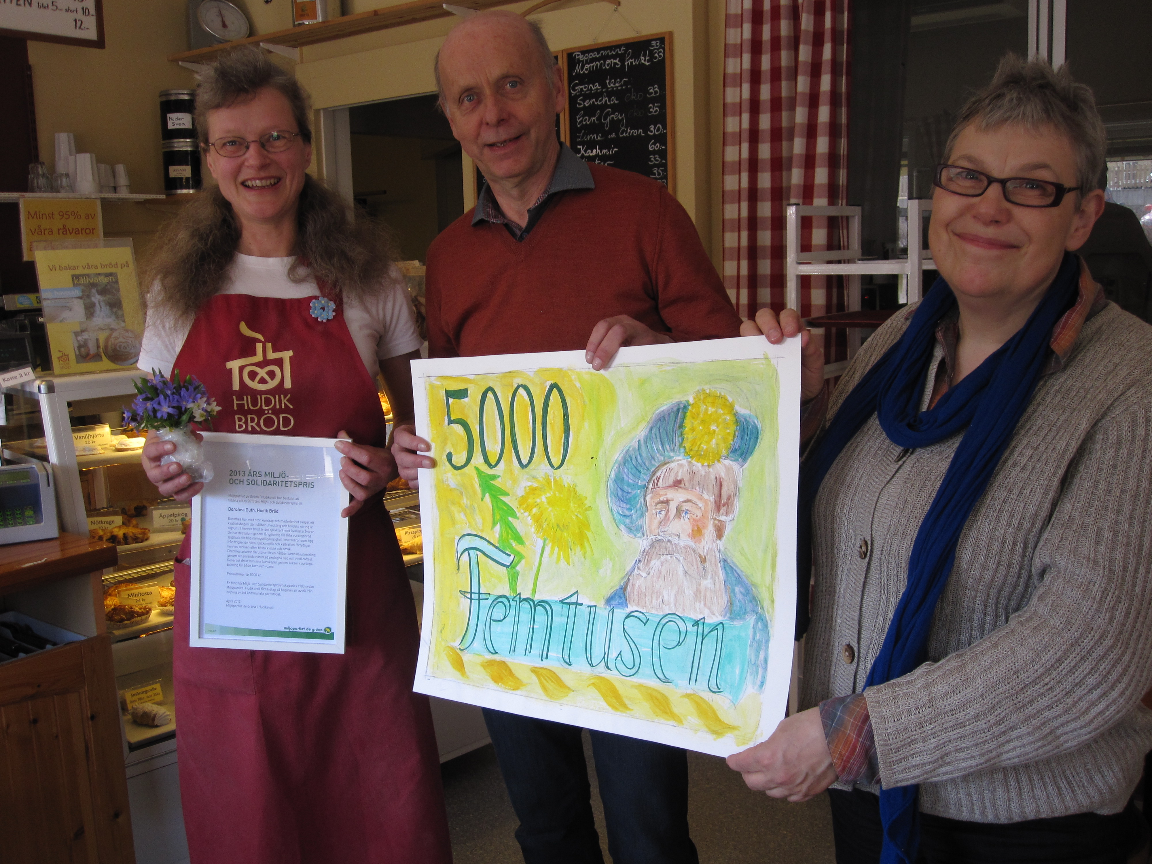 Miljöpriset MOS delades för i år ut till en glad Dorothea Guth – bagare och företagare på HUDIKBRÖD på Träffpunkten på Öster i Hudiksvall. Kommunalrådet Kåge Wallner och MP:s ordförande Lena Husén verkade lika glada att, på detta sätt, kunna uppvakta denna ambitiösa bagare som inte tummar på kvalitet, smak eller hälsa.