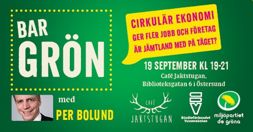 Cirkulär ekonomi ger fler jobb och företag- är jämtland med på tåget? I det cirkulära sammhället finns inget avfall, bara resurser- vasslen från osten tas tillvara och görs till messör, men visste du att vassle också kan användas som aktiv ingrediens i rengöringsprodukter? Det är just det en av kvällens representerade företag- BioGen Active från Gällö har gjort. Per Bolund och en panel av företagare och andra aktörer i Jämtland Härjedalen debatterar och publiken kommer med frågor och inspel. Evenemanget är kostnadsfritt, och det bjuds på Jämtländska delikatesser. Bar Grön är ett arrangemang för mingel, samvaro och samtal om politik, engagemang och visioner. Per Bolund är finansmarknads- och konsumentminister samt biträdande finansminister som driver på hårt för hållbar konsumtion och cirkulär ekonomi i regering och riksdag.Paneldeltagare: