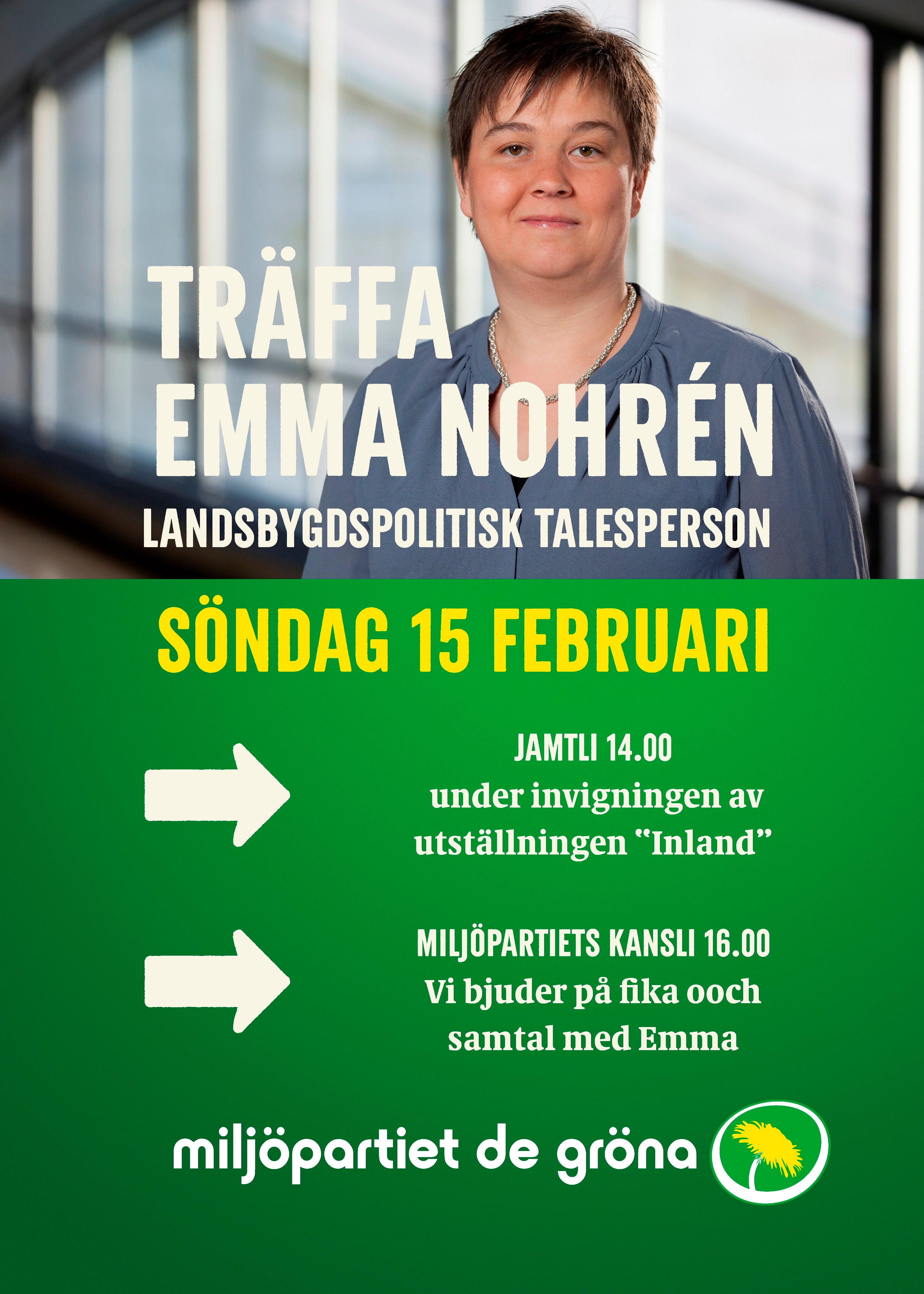 Ursäkta den väldigt korta framförhållningen för det här besöket, men våran nya landsbygspolitiska talesperson i riksdagen Emma Nohrén besöker Östersund på söndag den 15 februari. Hon gör ett besök i Västernorrland och frågade om vi ville att hon tittade förbi när hon ändå var i krokarna, och vi svarade självklart ja. Eftersom att Emma är landsbygdspolitisk talesperson så hoppas vi att vi kommer att få mycket att göra med henne.