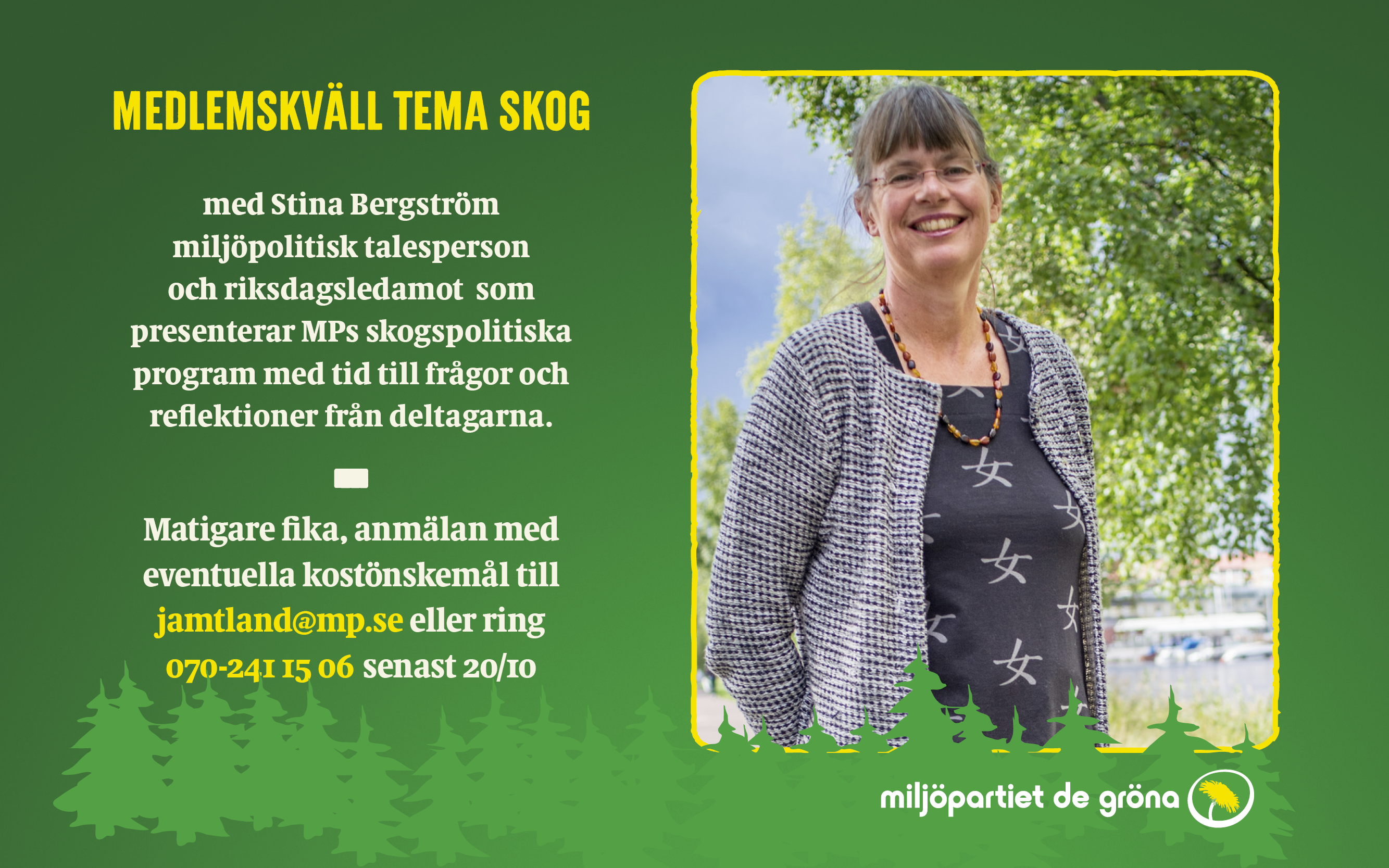 Medlemskväll tema skog med Stina Bergström miljöpolitisk talesperson och riksdagsledamot som presenterar MPs skogspolitiska program Matigare fika, anmälan med eventuella kostönskemål till jamtland@mp.se eller ring 070-241 15 06 senast 20/10
