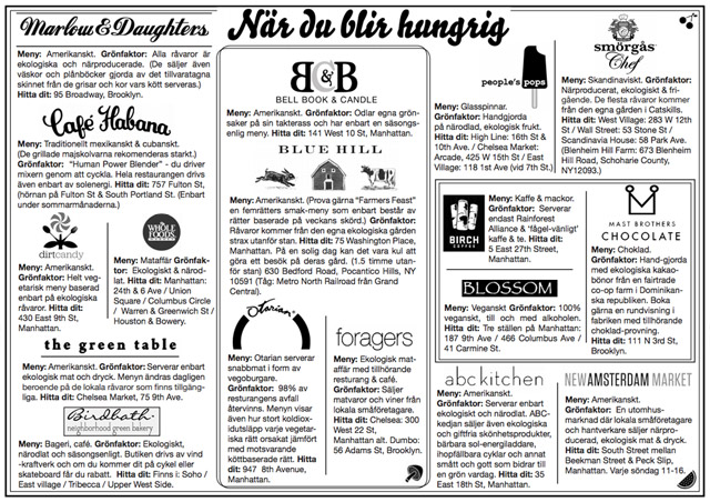 - Att göra – förslag på aktiviteter som man kan göra utan att belasta miljön med ökade koldioxidutsläpp. T.ex. promenera igenom High Line Park i Meatpacking District eller paddla kajak på Hudson River.