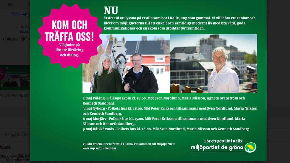 6 maj Morjärv – Folkets Hus kl 15.00. Möt Peter Eriksson tillsammans med Sven Nordlund, Maria Nilsson och Kenneth Sandberg