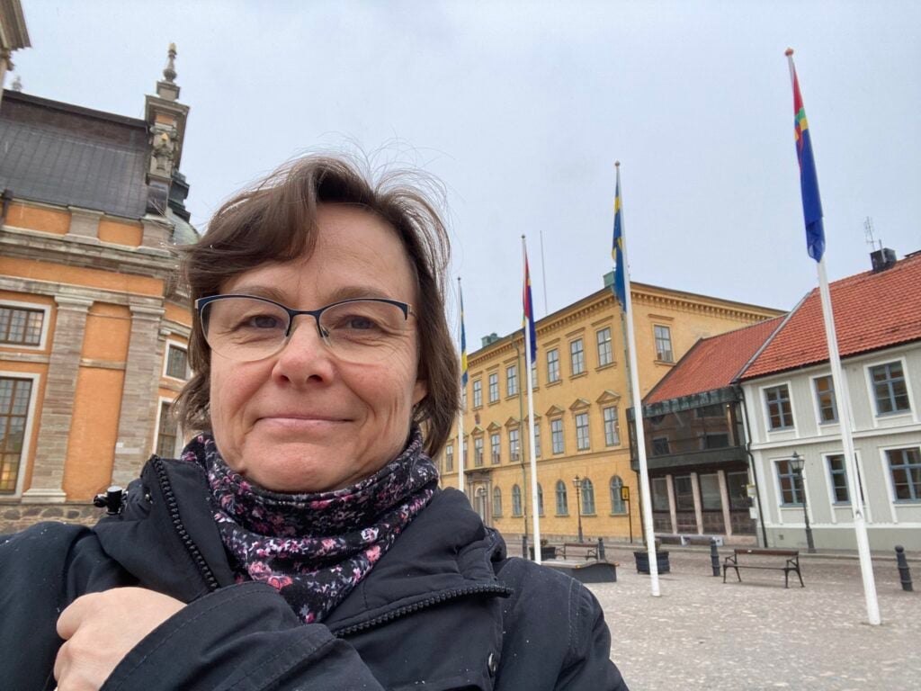 På bilden ser du vår gruppledare Annika Carlsson Wistedt framför flaggstängerna på Stortorget där den samiska flaggan vajar.