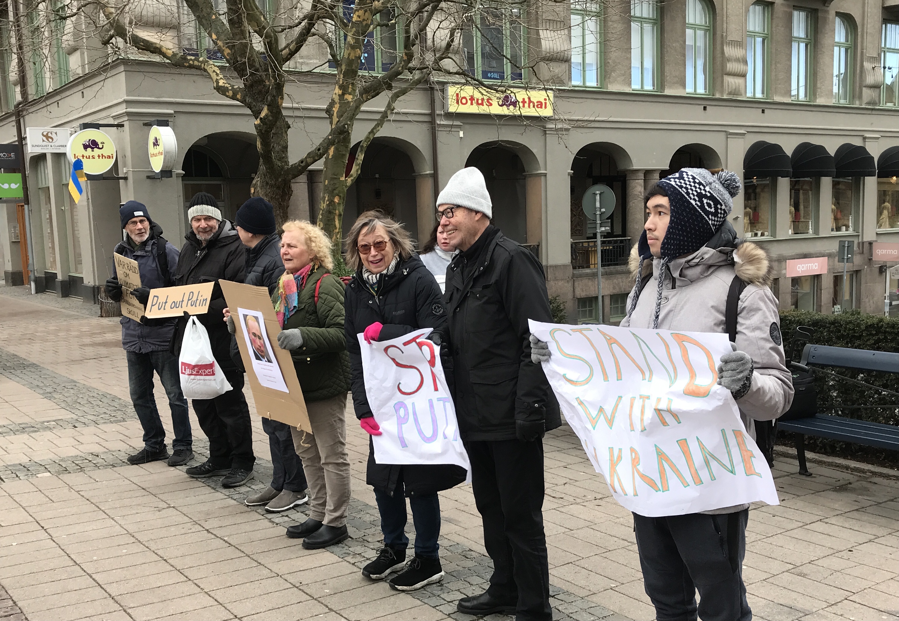 Idag samlades ett 30-tal personer på Klaipedaplatsen i Karlskrona för att visa vår solidaritet för det ukrainska folket vars land har blivit invaderat av Ryssland. Av de som var där var sex medlemmar i MP Karlskrona. Överfallet på Ukraina är ett helt oprovocerat angrepp på ett demokratiskt land så nu måste hela övriga världen markera sitt avstådstagande till Ryssland mycket tydligt genom sanktioner, bojkotter etc. I dagens Sydöstran kunde vi läsa att flera idrottsutövare och idrottsförbund väljer att inte åka till Ryssland vilket hedrar dem.