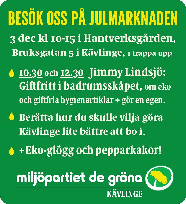 På lördag är det dags för julmarknad i Kävlinge. Nytt är att du denna gång träffar oss i Miljöpartiet i nya lokaler på Hantverksgården, Bruksgatan 5, en trappa upp. Där kommer du att kunna träffa Jimmy Lindsjö som vet hur man håller giftfritt i badrumsskåpet. Och som vanligt bjuder vi på ekoglögg och pepparkakor.