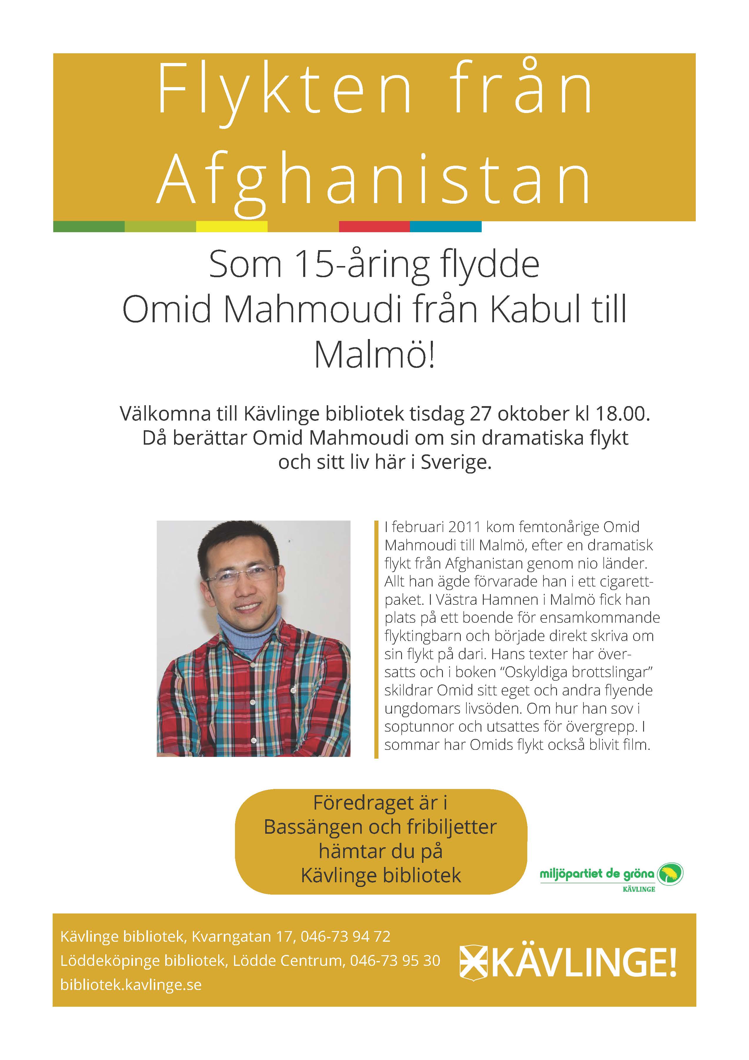 Imorgon kväll, tisdagen den 27 oktober kl 18, har du chansen att höra Omid Mahmoudi berätta om sin dramatiska flykt från Afghanistan som 15-åring.