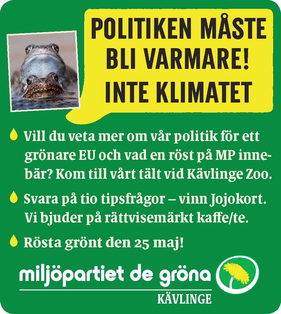 Vill du veta mer om vår politik för ett grönare EU och vad en röst på MP innebär? Kom till Kävlinge vårmarknad och vårt gröna tält vid Kävlinge Zoo! Vi kommer att ha frågesport där du kan vinna ett Jojokort. Och så bjuder vi på rättvisemärkt kaffe och te och tar emot dina frågor och synpunkter om grön politik, i Kävlinge och Skåne, Sverige och EU.