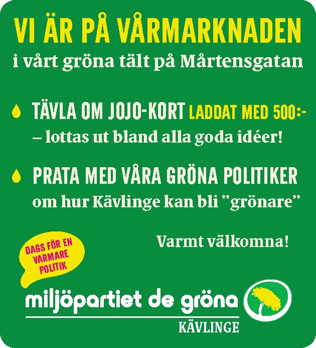 På lördag den 14 maj kl 10-15 finns vi i det gröna MP-tältet på Mårtensgatan, nära Hellbergs bokhandel. Kom gärna och prata en stund med oss om vad du tycker kan bli bättre i kommunen! Då är du också med i dragningen av ett Jojo-kort laddat med 500 kr. Dessutom bjuder vi på kravbananer, ekologisk flädersaft och påsar med ringblommefrön. Hoppas vi ses!