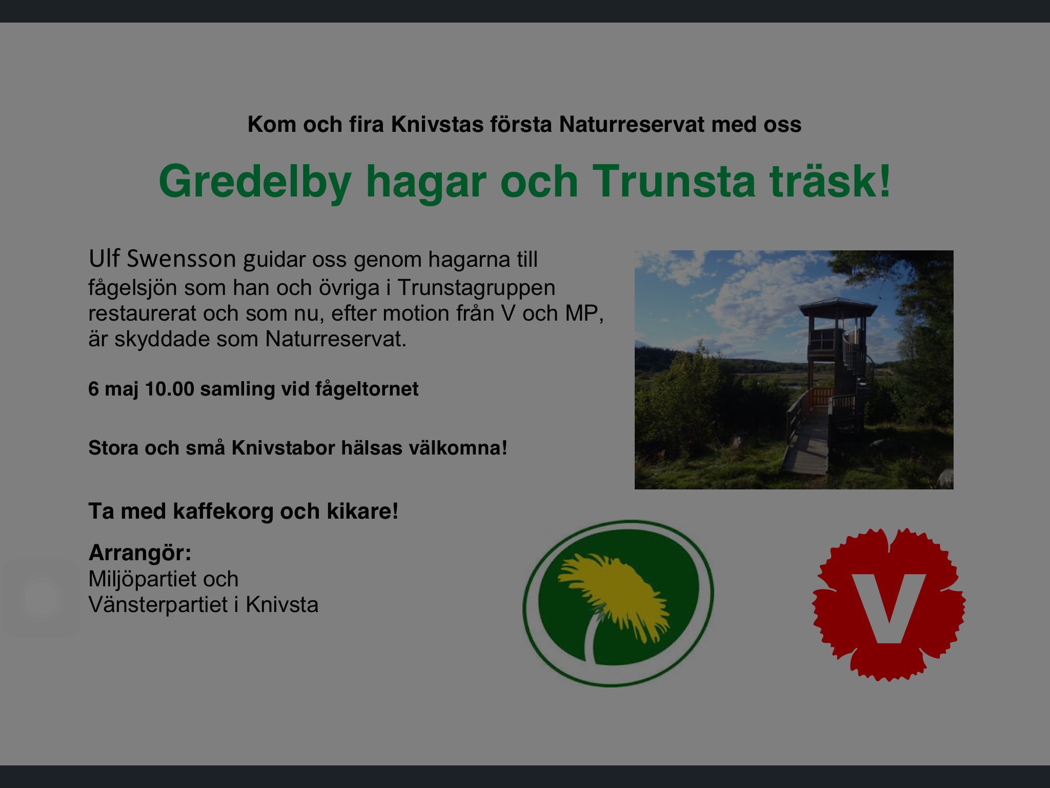 På kommunfullmäktige biföll ett enat fullmäktige MP och Vs motion om att inrätta Knivsta kommuns första kommunala reservat. Äntligen, får man väl säga! Detta kommer att firas 6/5 på plats, enligt bifogade inbjudan!