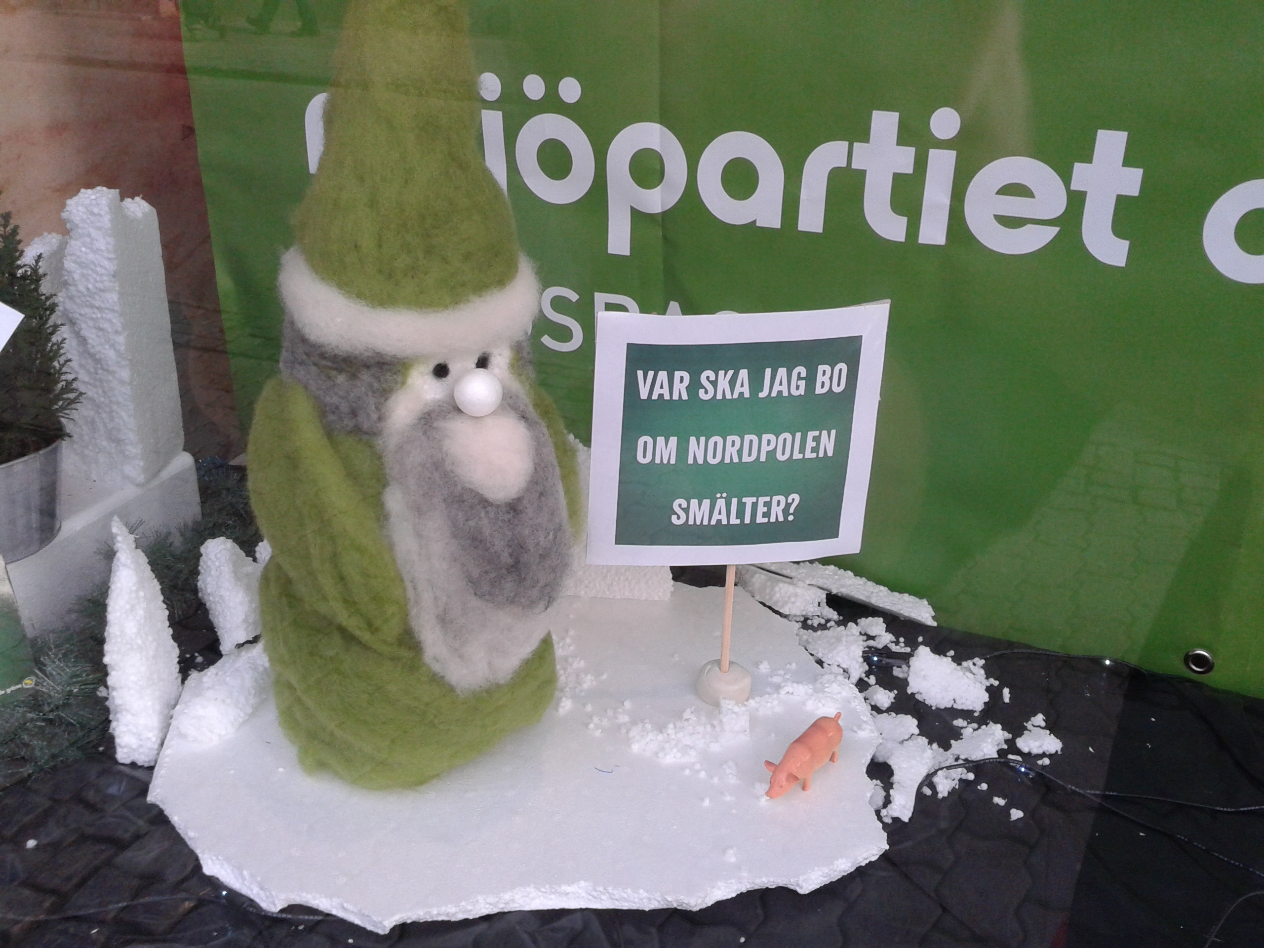 Hela eftermiddagen hade vi besökare i alla åldrar. Vi bjöd på ekologisk glögg och pepparkakor och fick många fina samtal. Vårt nypimpade skyltfönster går i klimatets tecken. Var ska tomten bo om isen smälter? Vi bjuder på klimatterapi! Inspiration till julklappar för den miljömedvetne finns i fönstret hela december.