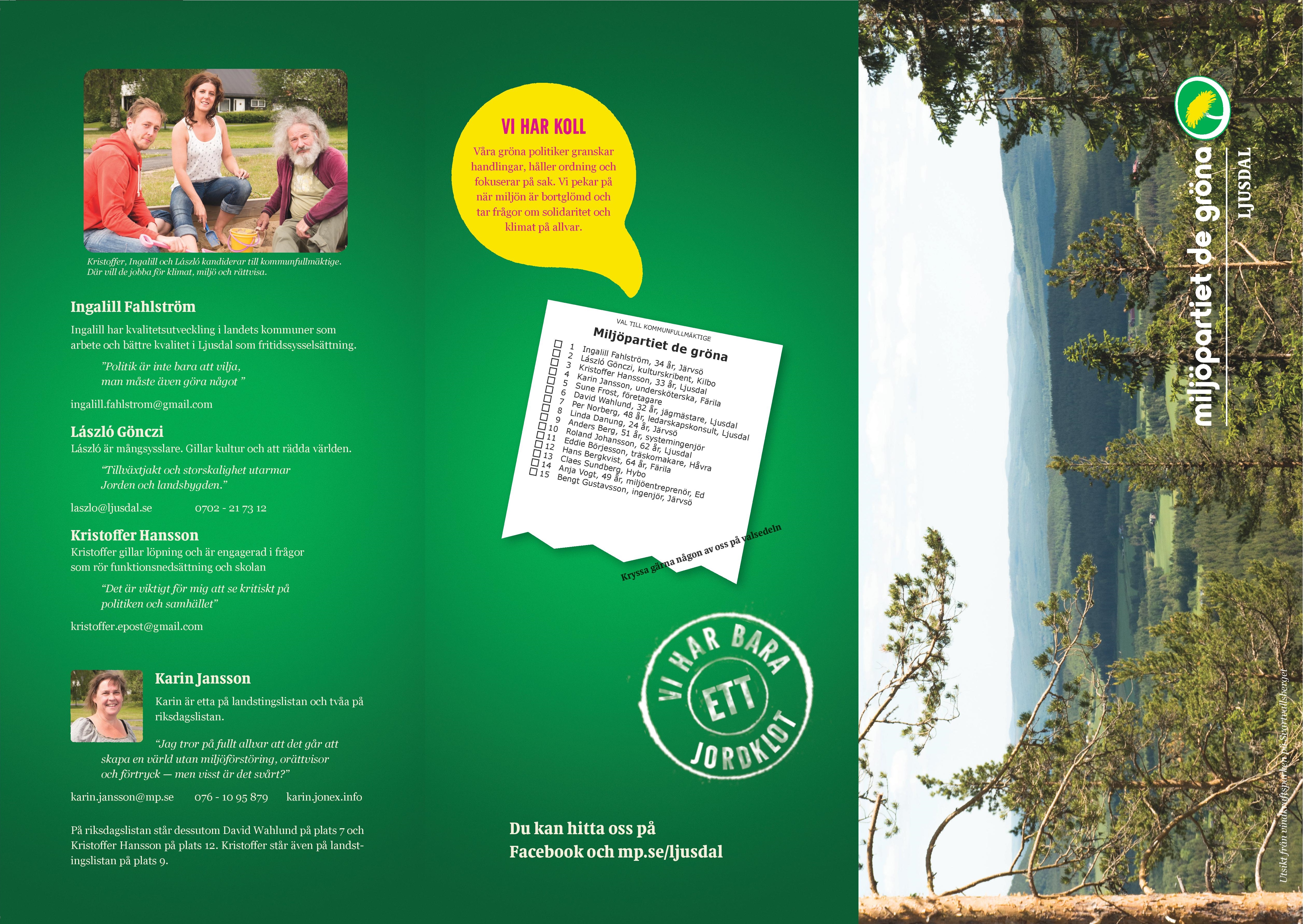 Detta är första delen av broschyren som skickas ut till kommunens invånare, i den kommer det att bland annat stå om våra åsikter om vad som är viktigt för oss (syns i del två). Vidare kommer våra 3 toppkandidater till kommunfullmäktige kommer att få en rad, här kommer även Karin Jansson som står som nummer 1 på landstingslistan att få några rader.