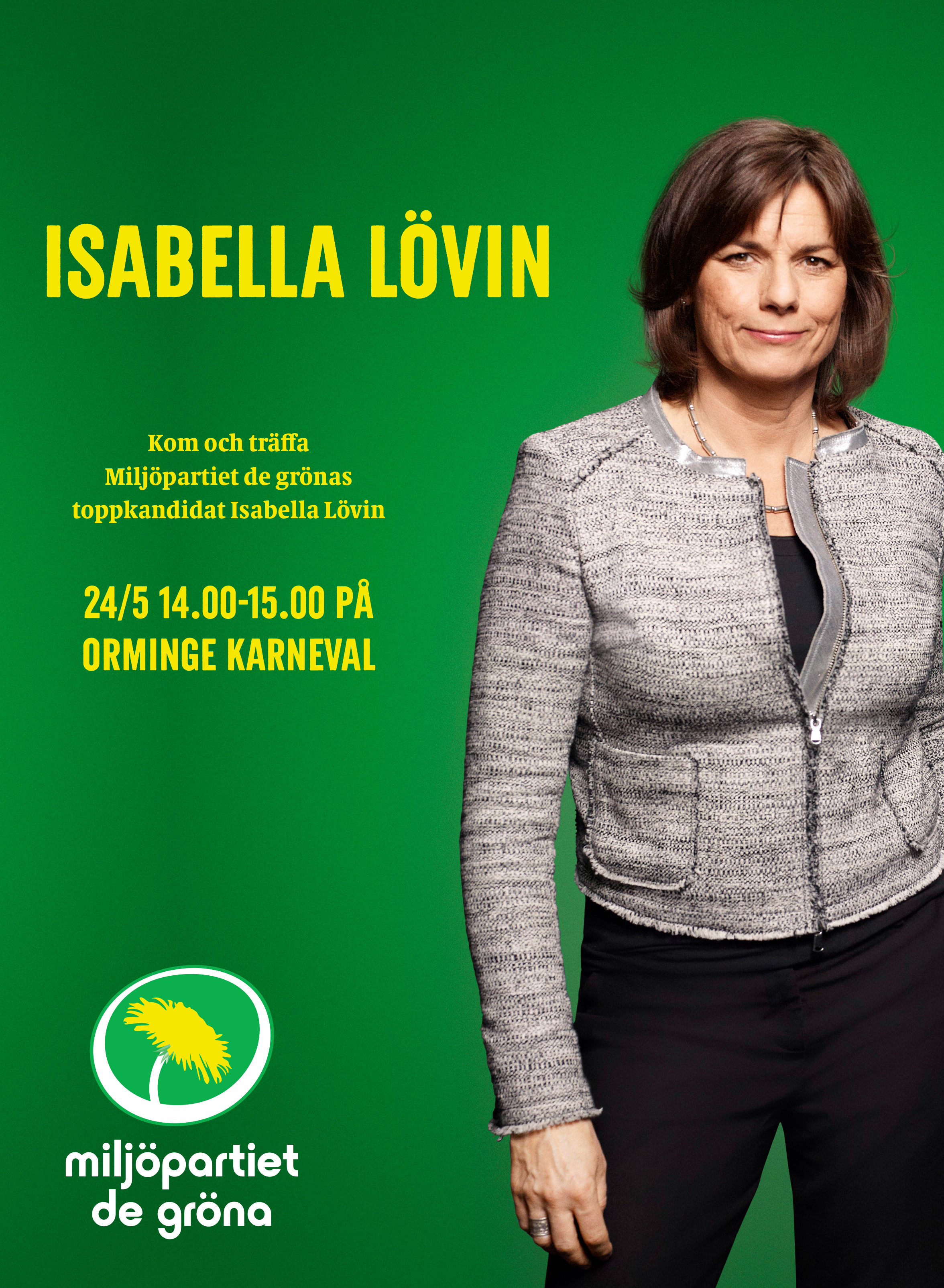 Miljöpartiets toppnamn Isabella Lövin gästar Orminge Karneval! Lördagen den 24 maj kl. 14.00-15.00 finns hon på plats i Miljöpartiets tält för att svara på frågor om EU och Miljöpartiets EU-politik.
