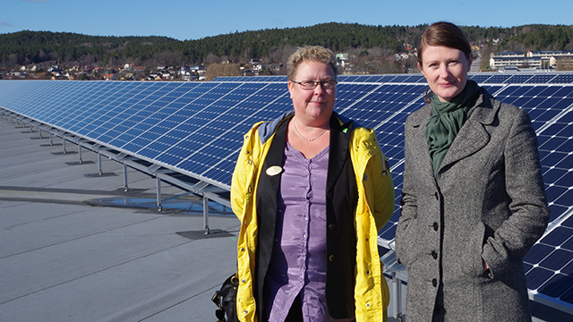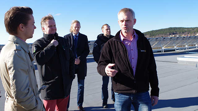 Miljöpartiets energipolitiska talesperson, Lise Nordin, Grön Ungdoms språkrör, Lorentz Tovatt och oppositionsråd Mia Sköld besökte Haugengruppens stora lagerbyggnad och solcellsanläggning i Åby utanför Norrköping.