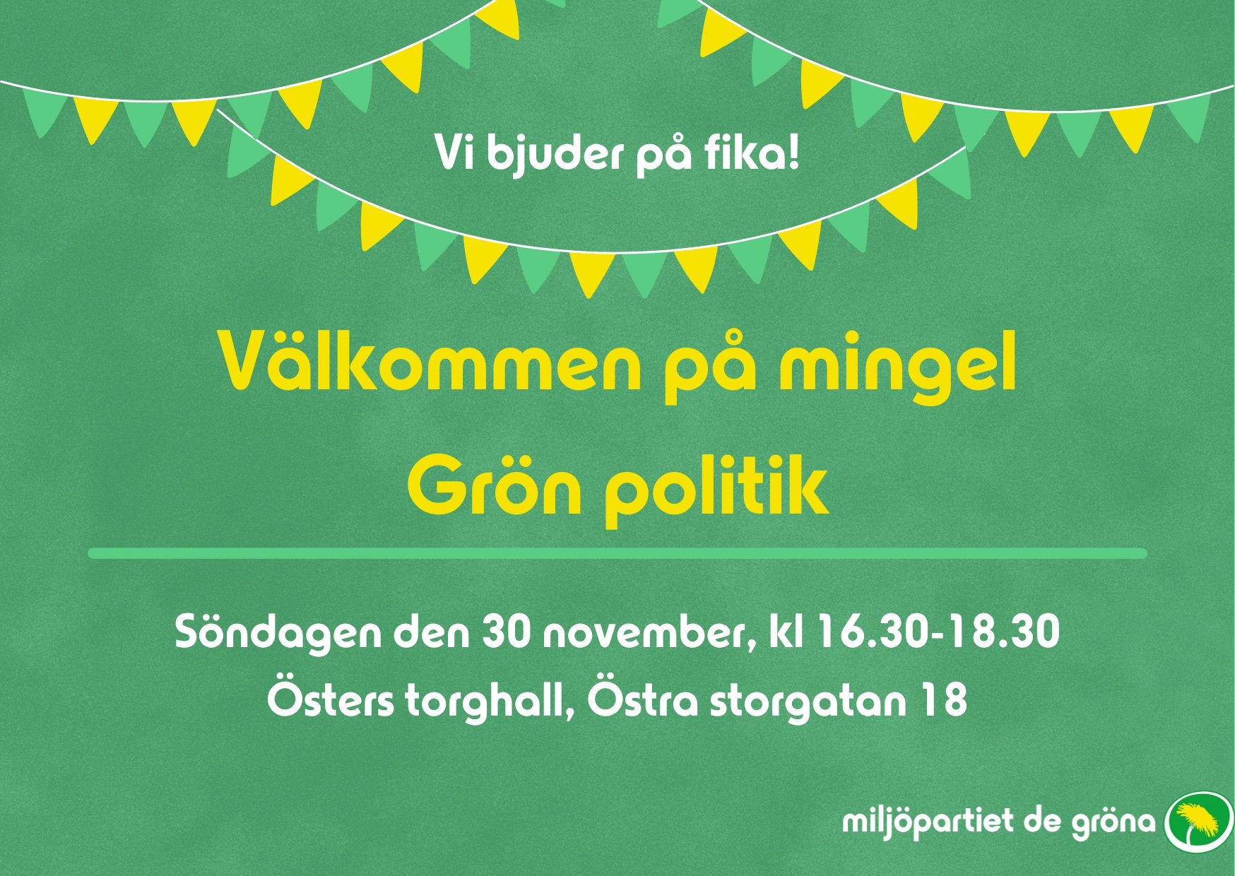 Söndagen den 30 november bjuder Miljöpartiet i Nyköping in till mingel om grön politik. Vi håller på att utveckla politik inför valrörelsen 2026 och vill gärna ha er input! Alla är välkomna, från engagerade medlemmar, intresserade kommuninvånare, föreningar, företag, intresseorganisationer m fl