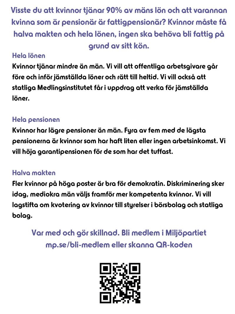 För att uppmärksamma den internationella kvinnodagen så kommer Miljöpartiet de gröna att vara på torget i Olofström lördagen den 7 mars ungefär mellan kl. 12 och 14.