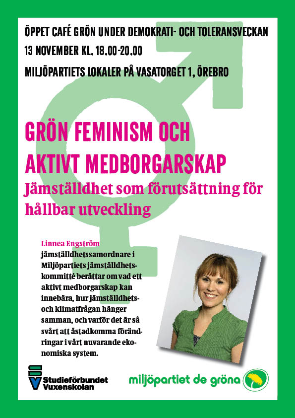 Café Grön är en öppen aktivitet som arrangeras av Miljöpartiet de gröna och Studieförbundet Vuxenskolan. Alla är välkomna, ta gärna med en vän!