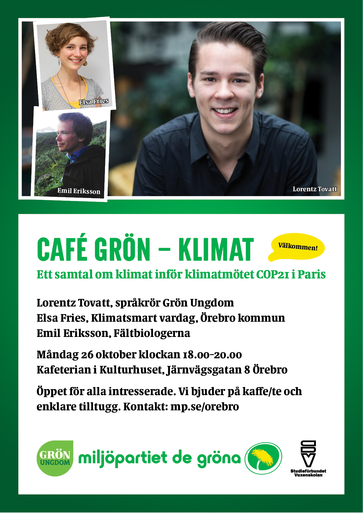Medverkar gör Lorentz Tovatt, språkrör för Grön Ungdom, Elsa Fries, Örebro kommun och projektet Klimatsmart vardag samt Emil Eriksson från Fältbiologernas riksstyrelse. De kommer berätta om sina respektive organisationer och projekt och sedan finns det möjlighet att ställa frågor.