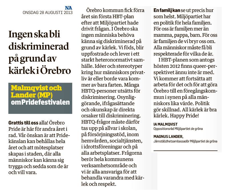 Debattinlägg av Ia Malmqvist och Magnus Lander i NA 28 augusti 2013