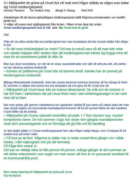 Vi i Miljöpartiet de gröna på Orust fick ett mail med frågor ställda av några som kallar