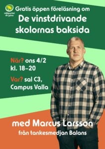 Skolnätverket i Östergötland bjuder in till en gratis, öppen föreläsning med Marcus Larsson från tankesmedjan Balans. Marcus kommer att prata om marknadsskolans baksida och hur vinstdrivande skolor påverkar lärare, elever och samhället.