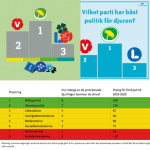 Även i Djurens Rätts undersökning står Miljöpartiet som vinnare – både i granskningen av förd politik och löften inför kommande mandatperiod. Miljöpartiet driver aktivt frågor som förbud mot hönor i burar, förbud av pälsdjursfarmning, stopp för plågsamma bedövningsmetoder vid slakt och utfasning av djurförsök.
