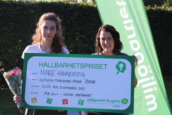 För fjärde året i rad delades Miljöpartiet i Skånes hållbarhetspris ut i helgen. Under pompa och ståt fick årets prisvinnare Marie Hannerstig ta emot blommor och prischecken på 7 500 kronor under Miljöpartiet i Skånes inspirationsdag i Eslöv i lördags.