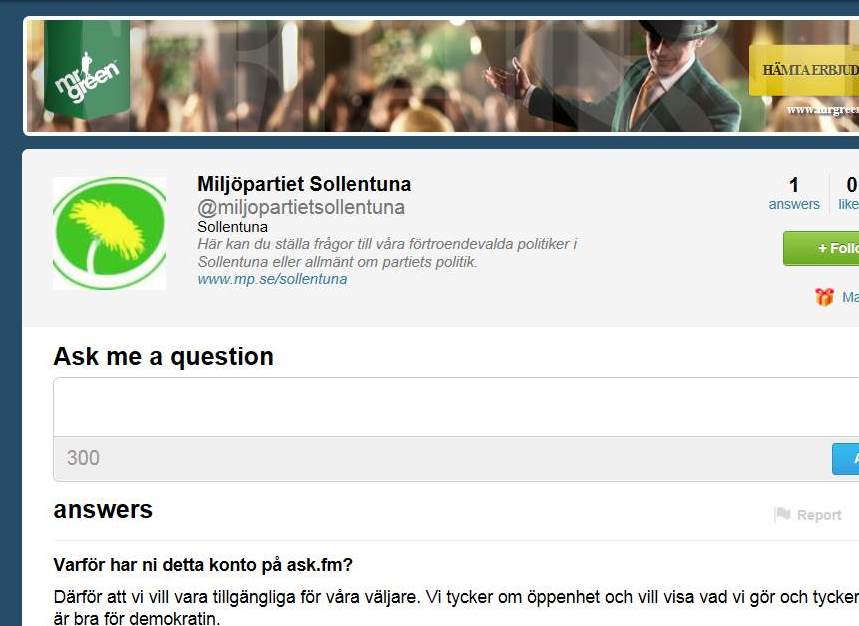 Vår valstuga står på Turebergs torg. Men det finns de som inte hinner dit under dagtid, eller undrar över något vid en annan tid på dygnet och vill kontakta oss. Det går att skriva till sollentuna@mp.se. Men nu öppnar vi även för möjligheten att göra det via sajten Ask.fm. Där får vem som helst ställa frågor (max 300 tecken) till oss och våra förtroendevalda, även anonymt. Vårt svar publiceras direkt på hemsidan så att svaren kan läsas av alla.