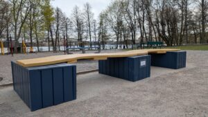Vinnaren heter Mila, och hennes bänk har nu byggts på riktigt – en stor bänk med blåa ”fötter” och en svängig gul sittyta som nu pryder Augustendals lekplats.