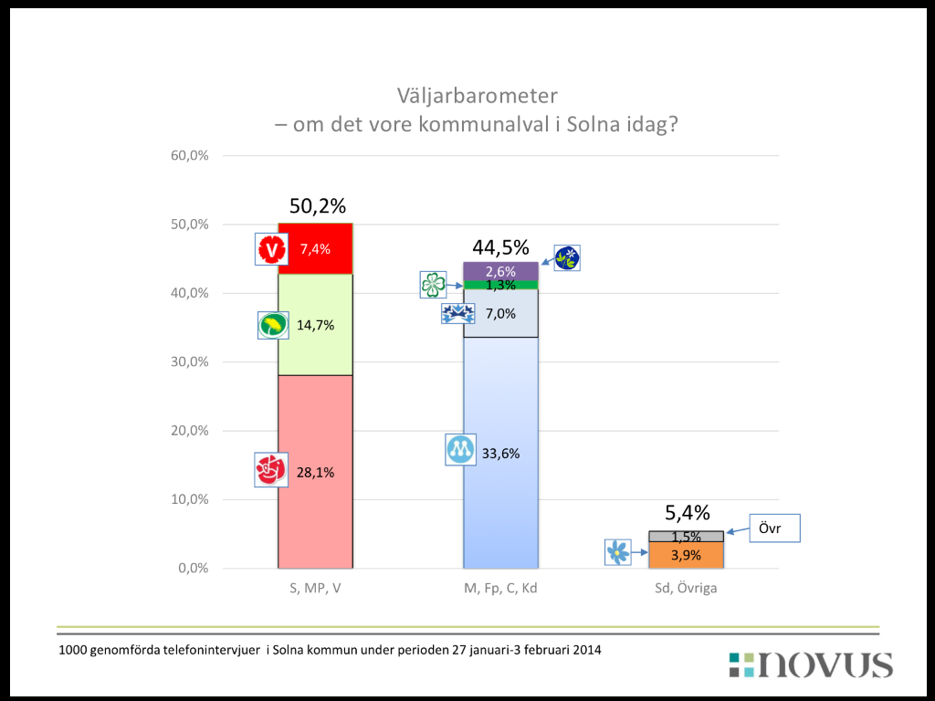Undersökningen genomfördes av Novus, på uppdrag av Socialdemokraterna och Miljöpartiet i Solna, den 27 januari – 3 februari 2014. 1000 solnabor besvarade frågan Hur skulle du rösta om det vore kommunalval idag?