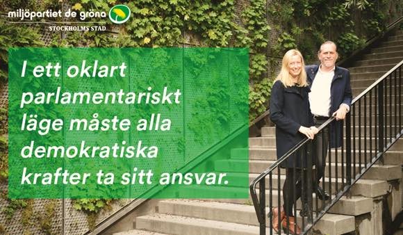 I ett oklart parlamentariskt läge måste alla demokratiska krafter ta sitt ansvar, vara villiga både att tala över blockgränser och att själva ingå i nya majoriteter. Det är att ta ansvar för Stockholms framtida styre. Det gör vi. Och det är så vi håller extremism och populism borta från inflytande, samtidigt som vi ser till så att Stockholm rustas för den största globala utmaningen: Klimatförändringarna.