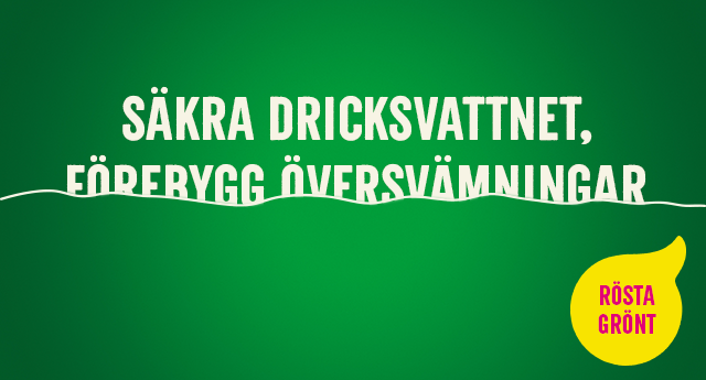 Allt fler kommuner har Mälaren som sin källa för dricksvatten. En förändring av vattenkvalitén i Mälaren på grund av klimatförändringar skulle ge stora problem för många kommuner i Stockholmsregionen. Därför behöver vi skapa fler källor för dricksvatten runt om i länet. De vattentäckter som finns behöver också skyddas bättre från föroreningar. Genom väl fungerande grönstruktur och dagvattendammar så nära källan som möjligt, kan förorenat dagvatten renas på bästa sätt. Vi vill även skapa fler vattenskyddade områden i länet. För att förekomma att dricksvattnet blir förorenat på grund av klimatförändringar vill vi även genomföra sårbarhetsanalyser på alla lokala vattenförsörjningssystem. Forskningsmedel från landstinget behöver avsättas till att ta fram nya reningsmetoder av dricksvatten.
