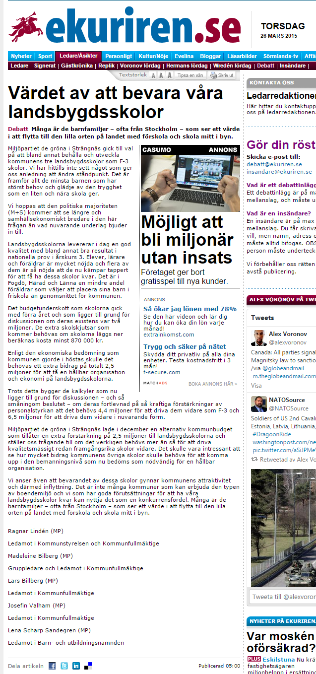 Miljöpartiet de gröna i Strängnäs lade i december en alternativ kommunbudget som tillåter en extra förstärkning på 2,5 miljoner till landsbygdsskolorna och ställer oss frågande till om det verkligen behövs mer än så för att driva kvalitetsmässigt redan framgångsrika skolor vidare. Det skulle vara intressant att se hur mycket bidrag kommunens övriga skolor skulle behöva för att komma upp i den bemanningsnivå som nu bedöms som nödvändig för en hållbar organisation.