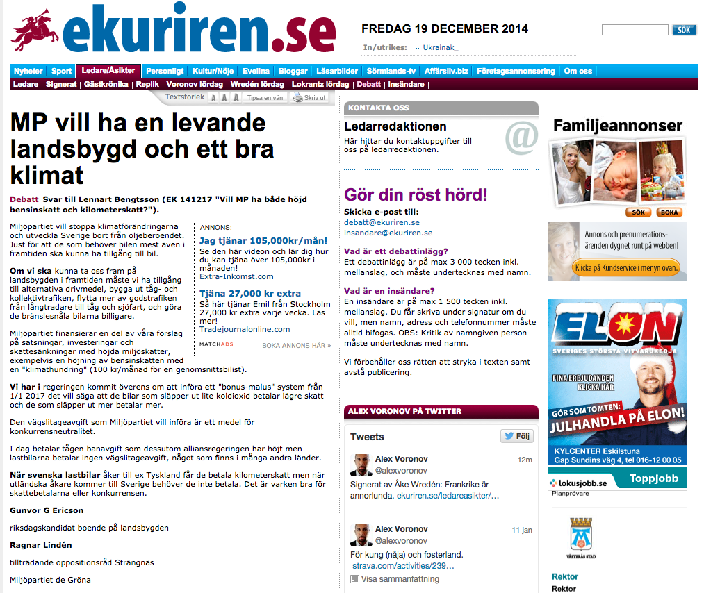 Debatt: Svar till Lennart Bengtsson (EK 141217 ”Vill MP ha både höjd bensinskatt och kilometerskatt?”).