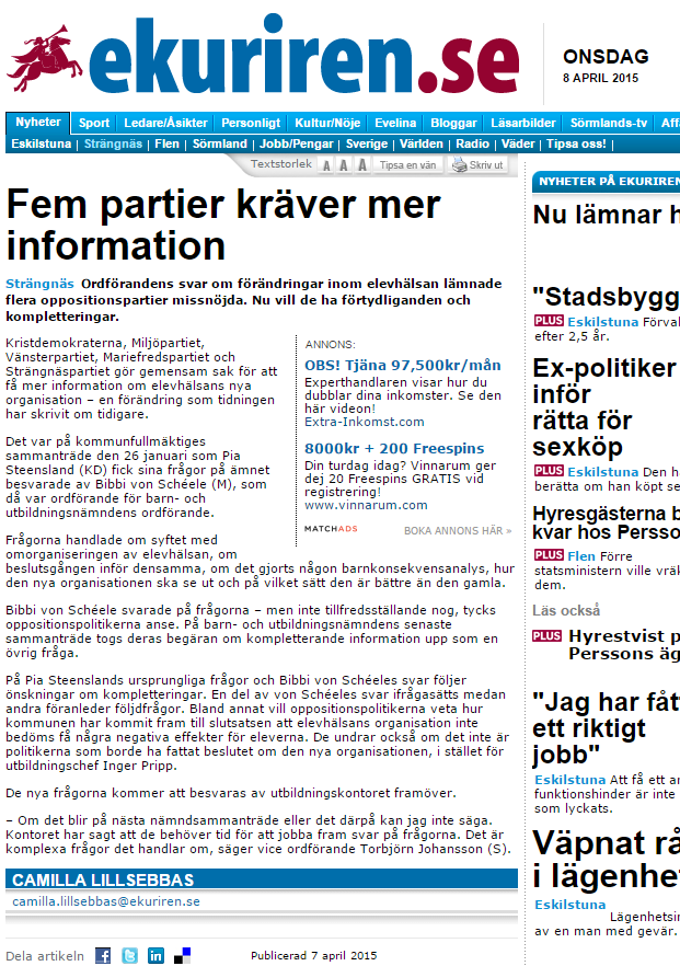Kristdemokraterna, Miljöpartiet, Vänsterpartiet, Mariefredspartiet och Strängnäspartiet gör gemensam sak för att få mer information om elevhälsans nya organisation – en förändring som tidningen har skrivit om tidigare.